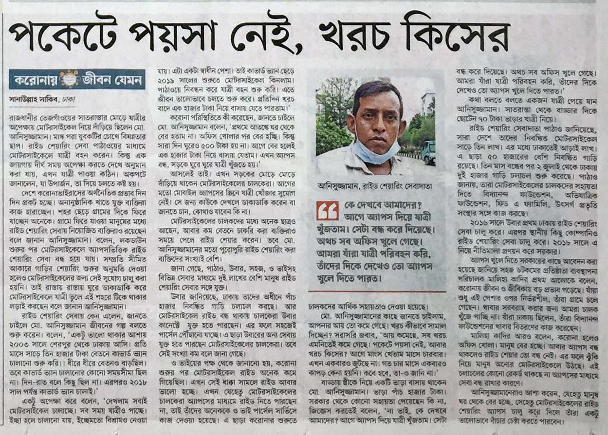 দেশে করোনাভাইরাসের অর্থনৈতিক প্রভাব দিন দিন প্রকট হচ্ছে। অনানুষ্ঠানিক খাতে যুক্ত ব্যক্তিরা কাজ হারাচ্ছেন। শহর ছেড়ে গ্রামের দিকে ফিরে যাচ্ছেন অনেকে। গ্রামে ফিরে যাওয়া মানুষের মধ্যে রাইড শেয়ারিং সেবায় নিয়োজিত ব্যক্তিরাও রয়েছেন বলে জানান আনিসুজ্জামান। বলেন, লকডাউন শুরুর পর মোটরসাইকেলে অ্যাপসভিত্তিক রাইড শেয়ারিং সেবা বন্ধ হয়ে যায়। সম্প্রতি সীমিত আকারে গাড়ির শেয়ারিং শুরুর অনুমতি দেওয়া হলেও মোটরসাইকেলের জন্য সেই সুযোগ চালু করা হয়নি। তাই রাস্তায় রাস্তায় ঘুরে ডাকাডাকি করে মোটরসাইকেলে যাত্রী তুলে এই শহরে টিকে থাকার লড়াই করছেন বলে জানান আনিসুজ্জামান।