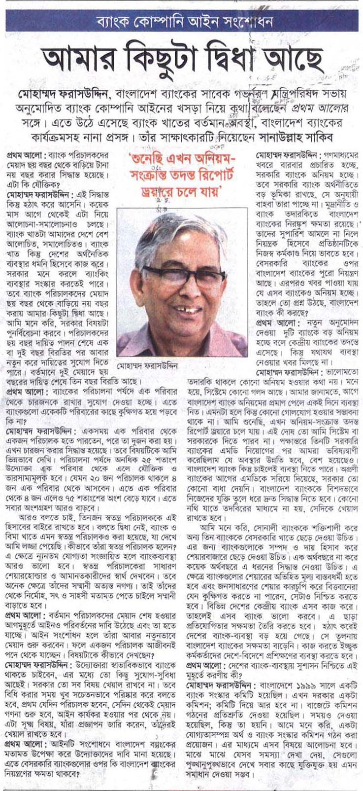 মোহাম্মদ ফরাসউদ্দিন, বাংলাদেশ ব্যাংকের সাবেক গভর্নর। মন্ত্রিপরিষদ সভায় অনুমোদিত ব্যাংক কোম্পানি আইনের খসড়া নিয়ে কথা বলেছেন প্রথম আলোর সঙ্গে। এতে উঠে এসেছে ব্যাংক খাতের বর্তমান অবস্থা, বাংলাদেশ ব্যাংকের কার্যক্রমসহ নানা প্রসঙ্গ। তাঁর সাক্ষাৎকারটি নিয়েছেন সানাউল্লাহ সাকিব