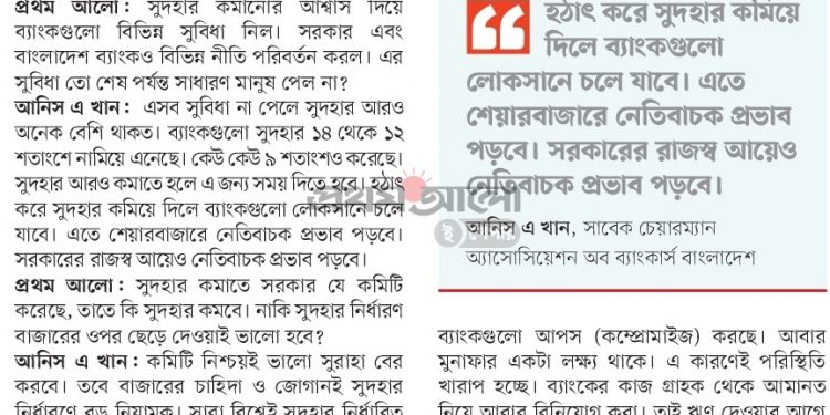 ব্যাংকে ঋণের সুদহার এক অঙ্কে নামিয়ে আনার ঘোষণা দেওয়া হয় দেড় বছর আগে। সুদহার কমানোর কথা বলে বেসরকারি ব্যাংকগুলো সরকারের কাছ থেকে বেশ কিছু সুবিধাও নিয়েছে। তবে সুদহার এখনো একক অঙ্কে নেমে আসেনি। এ অবস্থায় সুদহার কমাতে নতুন করে আবারও কমিটি গঠন করেছে সরকার। এসব বিষয় নিয়ে প্রথম আলোর সঙ্গে কথা বলেছেন ব্যাংকের প্রধান নির্বাহীদের সংগঠন অ্যাসোসিয়েশন অব ব্যাংকার্স বাংলাদেশের (এবিবি) সাবেক চেয়ারম্যান আনিস এ খান। সাক্ষাৎকার নিয়েছেন সানাউল্লাহ সাকিব